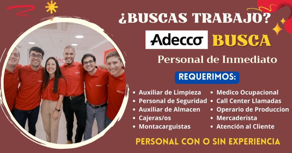 Si cumples con los requisitos que solicitamos no dudes en enviarnos tus documentos ingresando al siguiente enlace: Adecco Empleos en Peru / Postula Adecco en México / Aplica Adecco Colombia / Empleos en Adecco Uruguay / Trabaja en Adecco Argentina / Empleos en Adecco Chile /